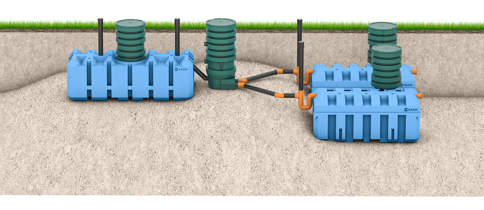 FANN Blue Trekammarbrunn tillsammans med FANN BDT INDRÄN Biobädd blir ett kompakt och mycket effektivt avloppssystem.