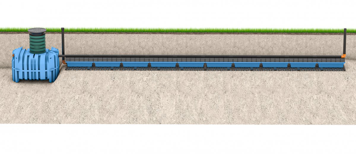 Infiltrationsanläggning med lågbyggande slamavskiljare tillsammans med INDRÄN Plus moduler som används för att effektivisera den biologiska reningsprocessen. INDRÄN Plus mer än tiodubblar ytan för den biologiska reningsprocessen. INDRÄN Plus är också ett komplett biofilter som ersätter grus-/stenlagret i en infiltration då den blå lådan redan innehåller ett prefabricerat grusmaterial.