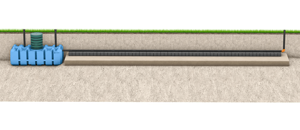 Infiltrationsanläggning med lågbyggande slamavskiljare tillsammans med INDRÄN PRO moduler som används för att effektivisera den biologiska reningsprocessen. INDRÄN mer än tiodubblar ytan för den biologiska reningsprocessen.