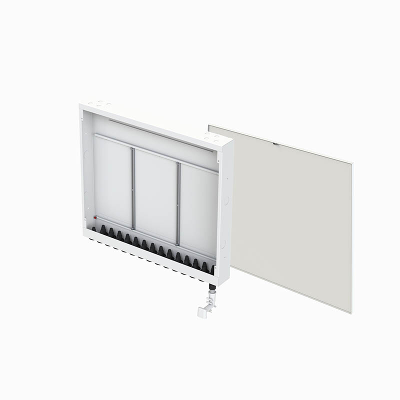 Installationsskåp för vattenburen golvvärme. Passar till BEVISAB golvvärmefördelare i storlekar från 7-11st slingor. Skåpet är tillverkat i vitlackerad plåt och är godkänt för säker vatten med tät botten och genomföringar av gummi för golvvärmeslangen. Eventuellt läckage leds ut genom ett urtag i botten på skåpet och vidare genom ett rör till en plats där det snabbt kan upptäckas.