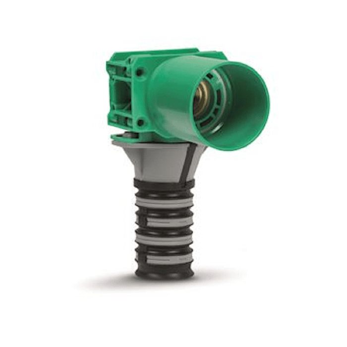 Väggbox med flexibel underdel, kongreppskoppling 16mm, vinkel av rödgods med invändig gänga Rp 15, förlängning av plast, låsclips och montageskruvar.