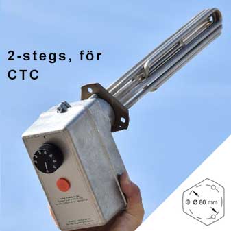Elpatroner, 2-stegs, med CTC-anslutning / trekantsfläns, anpassade för vattenuppvärmning i värmepannor och ackumulatortankar med termostatstyrning 30-90°C. Dessa elpatroner finns med olika effekt: 2,25kW, 3kW, 4,5kW, 6kW samt 9kW och monteras med triangelfäste, oftast CTC.