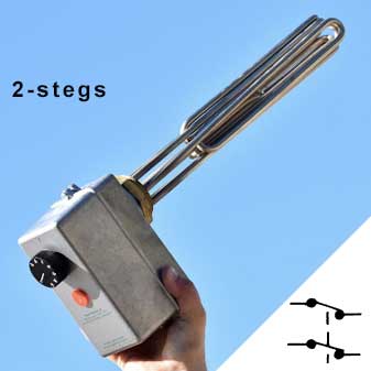 Försedd med direktbrytande styrutrustning i en kopplingsbox innehållande 2-stegs termostat 30-90°C och 3-poligt överhettningsskydd.