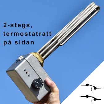 Elpatroner, 2-stegs, anpassade för vattenuppvärmning i värmepannor och ackumulator-tankar med termostatstyrning 30-90°C. Termostatratt på sidan. Dessa elpatroner har termostat-ratt och återställning på sidan av kopplingsboxen, för enkel och smidig åtkomst i trånga utrymmen. De finns med effekterna 1,5kW, 2kW, 2,25kW, 3kW, 4,5kW, 6kW, 7,5kW, samt 9kW, och monteras i R50-gänga.