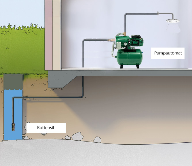 Självsugande tekniken betyder att man kan installera pumpen i huset och suga vattnet från t.ex. grävd brunn eller sjö. Installera alltid en bottenventil i slutet på slangen för bästa prestanda och längsta möjliga livslängd.