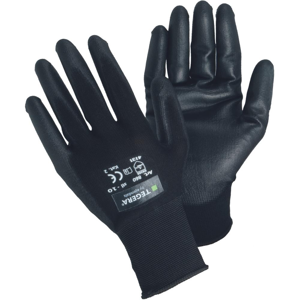 För monteringsarbeten och arbetsuppgifter där högsta krav på smidighet och fingertoppskänsla krävs. T.ex. före och efter lackering, tillverkning, montage. Tät innerhand, silikonfri, ventilerad ovanhand, tvättbar i 40°C maskintvätt, mudd. Förpackade parvis. Material: PU-doppad nylon. Hög kvalité. Färg: Svart. Tegera Basic. Kat. II EN388 4131.